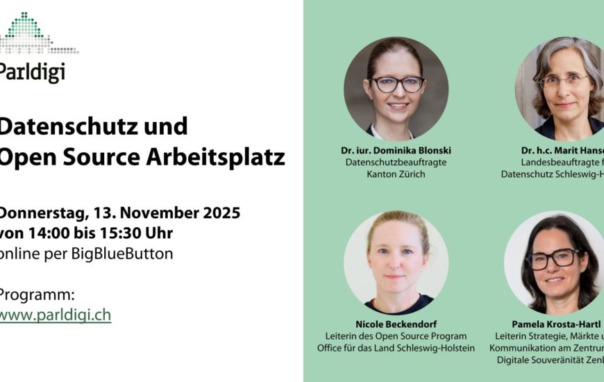 Am Donnerstag, 13. November 2025 führt die Parlamentarische Gruppe Digitale Nachhaltigkeit von 14:00 bis 15:30 Uhr ein Online-Event zu Datenschutz und Open Source Arbeitsplatz durch. Der Anlass geht der Frage nach, welche Datenschutzprobleme es bei der Public Cloud Nutzung durch...