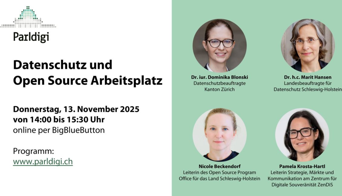 Am Donnerstag, 13. November 2025 führt die Parlamentarische Gruppe Digitale Nachhaltigkeit von 14:00 bis 15:30 Uhr ein Online-Event zu Datenschutz und Open Source Arbeitsplatz durch.